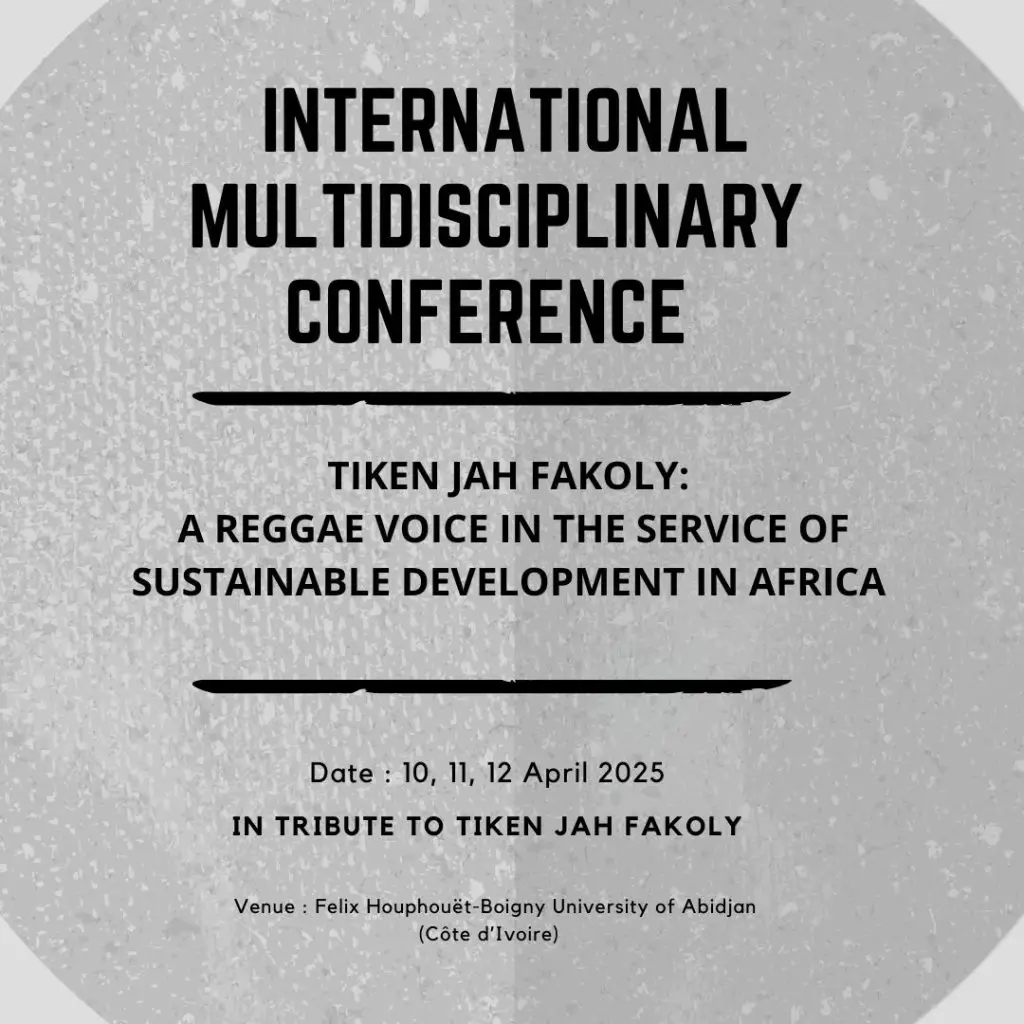 As part of the University Festival of Arts and Cultures of Africa and Beyond (FUACAA 2025), the Félix Houphouët-Boigny University of Abidjan, in partnership with the Laboratory of Communication, Arts, and Culture Sciences (LSCAC) and the Research and Action Group on Culture, Education, Health, and Society in Africa (GRACES), is organizing a unique conference around the theme: 🎶 “Tiken Jah Fakoly, a Voice of Reggae for Sustainable Development in Africa” 📅 Dates: April 10, 11, and 12, 2025 📍 Location: Félix Houphouët-Boigny University of Abidjan (Ivory Coast) This multidisciplinary conference will explore the artistic and activist contributions of Tiken Jah Fakoly to the promotion of sustainable development in Africa. 👉 Learn more and get involved