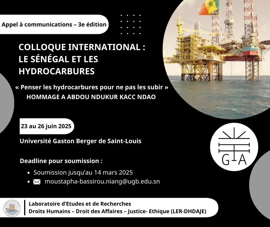 CALL FOR PAPERS – 3rd EDITION OF THE INTERNATIONAL CONFERENCE 📢 “Senegal and Hydrocarbons” 📍 Université Gaston Berger de Saint-Louis 📅 June 23-26, 2025 📝 Submission Deadline: March 14, 2025 💡 Main Theme: “Thinking Hydrocarbons to Avoid Suffering Them” As Senegal embarks on the exploitation of its hydrocarbon resources, this conference seeks to foster interdisciplinary scientific discussions on the economic, social, environmental, and political challenges linked to this strategic resource. 🔎 Key Themes:✔ Hydrocarbon exploitation and transformations of local economies✔ Social transformations and politico-identity changes✔ Strategic, economic, and ecological challenges✔ Contractual policies and taxation 📩 Submit your proposals (written paper or poster) by March 14, 2025, at:✉ moustapha-bassirou.niang@ugb.edu.sn 📚 Accepted papers will be reviewed and published in the conference proceedings. 🔗 More information available here