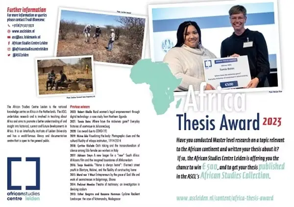 The award aims to encourage student’s research and writing on African topics and to promote the study of African cultures and societies. It is presented annually to a student whose master’s thesis has been completed on the basis of research conducted on an African topic. The award consists of a prize of € 500,- and publication of the winning thesis in the ASCL’s African Studies Collection. All theses submitted will be made available fulltext online via the ASCL’s library catalogue. For who Master students who have completed their thesis at a university on the African continent or in the Netherlands between 31 August 2022 and 31 August 2023 can apply for the Africa Thesis Award 2023. Students in the Netherlands must have received an 8 out of 10 or above. Students from non-Dutch universities with a grade A (or equivalent) may apply if the accompanying letter from the supervisor confirms the thesis’ excellence and supports the grade score. Deadline The deadline for applications is Wednesday 31 August. The prize will be presented to the winner during a special Africa Thesis Award Ceremony, where the winner will present his/her/their thesis. For more information: https://www.ascleiden.nl/content/africa-thesis-award