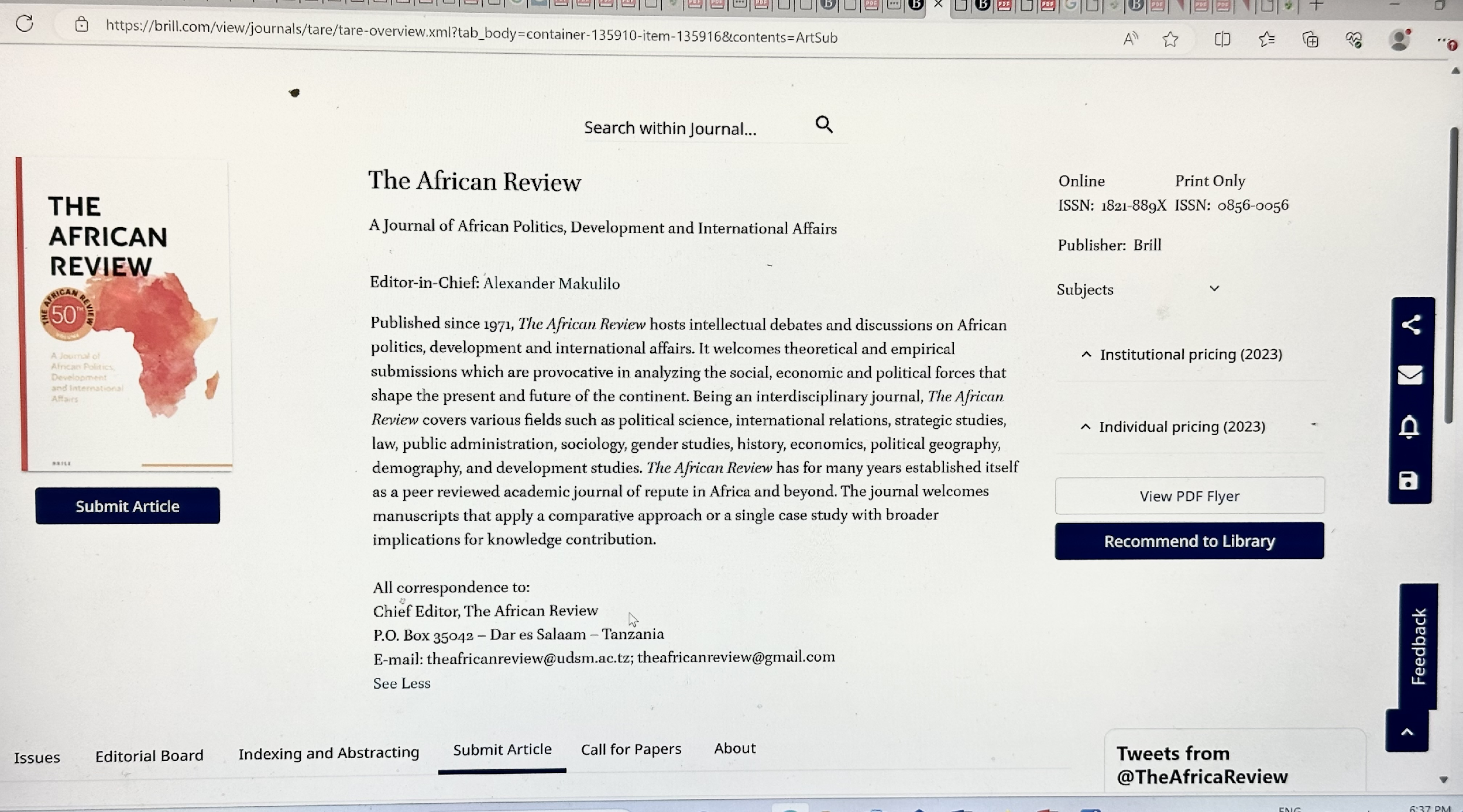 Mnamo 2021, The African Review (TARE) iliadhimisha miaka 50 tangu kuanzishwa kwake. Jarida hili lililoanzishwa na Idara ya Sayansi ya Siasa katika Chuo Kikuu cha Dar es Salaam (UDSM), limejikita zaidi katika kuondoa ukoloni wa tafsiri ya matukio muhimu ya siasa za Afrika yaliyohodhiwa na “wataalamu” wa kigeni, ishara ya mgawanyiko wa maarifa kati ya Kaskazini na Kusini. Katika kipindi cha miaka hamsini iliyopita, TARE imepitia awamu kuu tatu. Awamu ya kwanza ilikuwa ile ya kuchapishwa kwake moja kwa moja na idara ya sayansi ya siasa (1971-2018); awamu ya pili (2018-19) ilifanyika wakati jarida hilo lilipochapishwa na Dar es Salaam University Press (DUP); na awamu ya tatu ilianza 2019 wakati Brill alianza kuchapisha jarida. Wakati wa awamu hizi, TARE ilivutia maandishi kutoka kwa wasomi maarufu duniani na kuchapishwa mara kwa mara. Zaidi ya hayo, jarida limeorodheshwa katika hifadhidata zinazotambulika kama vile Scopus. Makala haya yanaangazia miaka hamsini ya kuwepo kwa TARE, ikizingatia siku zake za nyuma, za sasa na zijazo. Tunaona kuwa tangu 2019, TARE imekuwa ya kitaasisi zaidi na inayoonekana kimataifa. Kwa upande wa ubora, sasa inalinganishwa na baadhi ya majarida yenye sifa nzuri zilizochapishwa katika nchi za Kaskazini. Tunabisha kuwa ushirikiano wa ushindi kati ya majarida ya Kusini na wachapishaji imara unaweza kuboresha ubora na mwonekano wa kazi inayotolewa.