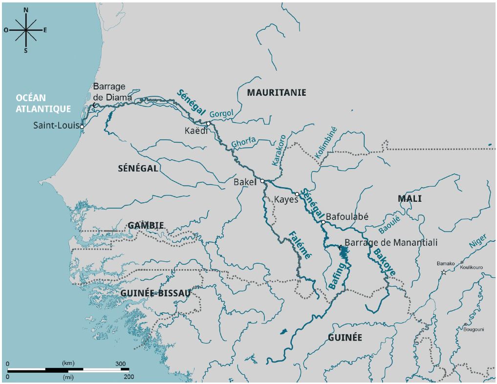 Le fleuve Sénégal est l’un des grands socio-écosystèmes de la façade atlantique de l’Afrique de l’Ouest. Il descend des massifs gréseux du Fouta Djalon puis traverse le plateau mandingue. Il résulte de la confluence de deux branches mères (le Bafing et le Bakoye) à Bafoulabé. À partir de Bafoulabé, le fleuve Sénégal se dirige vers le nord-est en passant par Kayes. Long de plus de 1 700 km, il draine un bassin-versant de 290 000 km² dans les territoires du Sénégal (21 000 km²), du Mali (155 000 km²), de la Guinée (31 000 km²) et de la Mauritanie (75 000 km²) (figure 1).