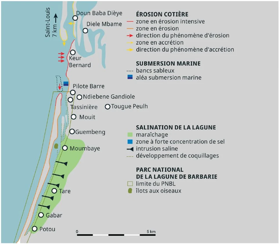 La région du Gandiol apparaît donc comme une zone économique et environnementale stratégique : les secteurs du maraîchage, de la pêche et du tourisme dépendent de manière de plus en plus prononcée des conditions climatiques et géophysiques et demandent à être de nouveau pensés pour nourrir des transitions soutenables (Sall, 2006). Le potentiel de développement de cette région a été impacté par l’ouverture de la brèche sur la Langue de Barbarie en 2003. Si la rive nord de la brèche, actuellement en reconstruction naturelle, apparaît comme le pôle principal d’équilibre de la Langue de Barbarie, la situation est plus problématique au sud. Dans la partie méridionale, la brèche continue en effet sa migration vers sa position d’avant 2003, naturellement dans le sens de la dérive littorale. Cette migration se superpose à un élargissement de la gueule causée par une érosion plus rapide (au sud) contre une sédimentation plus lente (nord). Ce mouvement méridional s’accompagne de dommages collatéraux (érosion, salinisation) et voue une partie des habitations de certaines localités comme Pilote Barre et Tassinière à la disparition. Ces menaces potentielles justifient des mesures fines de calibrages de politiques adaptatives afin de sécuriser les populations potentiellement impactées (Sy, 2015). Avant d’envisager quelles formes ces dernières peuvent prendre, revenons sur l’environnement institutionnel qui cadre l’action des pouvoirs publics et qui est susceptible de nous informer sur les capacités de résilience ou sur les points de blocage (verrous) des acteurs de la gouvernance des différents systèmes impactés.