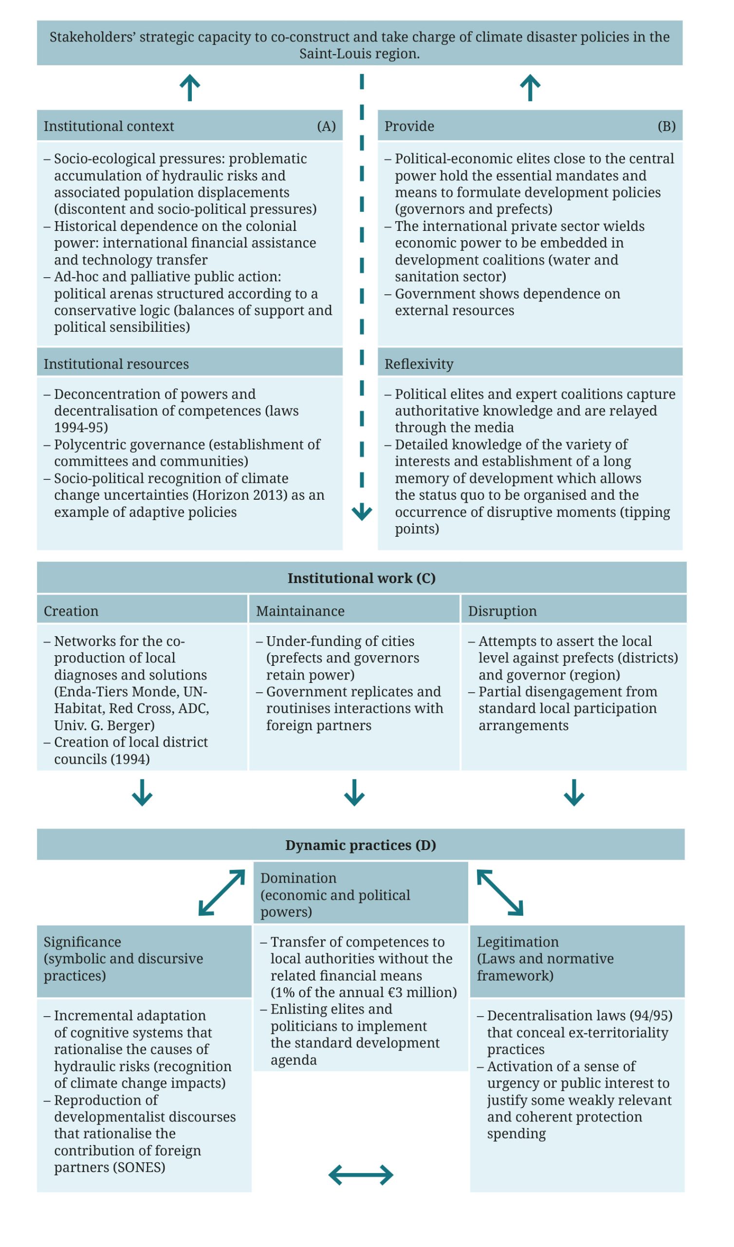 En guise de synthèse, la mobilisation d’une approche en termes de structuration relationnelle, inspirée de travaux comparables menés par R. Brown et al. (2018) sur le continent asiatique peut s’avérer utile. Elle permet de montrer que la co-construction d’une capacité stratégique afin de spécifier des politiques du désastre climatique pertinentes et cohérentes dans la région de Saint-Louis se heurte à des pratiques dynamiques conservatrices : ces dernières contribuent en effet à réduire le pouvoir transformateur des « travaux institutionnels » (Brown et al., 2018) engagés au niveau local et à renforcer la structuration institutionnelle ainsi que la configuration de pouvoir en place dans les échelles supérieures (voir tableau 2, encadrés C et D). Le rapport aux savoirs et pouvoirs « experts », notamment dans la spécification d’une planification adaptative face au changement climatique, reste ainsi prépondérant et devient problématique dans la mesure où il participe à la reproduction d’un système décisionnel caractérisé par une « mal-adaptation » manifeste (Magnan et al., 2016).