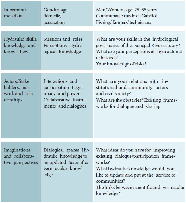 Les données empiriques utilisées dans cet article sont issues d’enquêtes de terrains réalisées pendant une période de « résidence observatoire » dans l’estuaire du fleuve Sénégal. La démarche déployée est qualitative7 . Les méthodes dites qualitatives n’ont pas pour objectif de fabriquer des données représentatives, c’est-à-dire généralisables à l’échelle d’un groupe social. La recherche qualitative est particulièrement appropriée lorsque les phénomènes sociaux observés sont difficiles à mesurer (Sawadago, 2020). Cet article s’inscrit dans cette perspective : il vise à décrypter les savoirs alternatifs portés par les communautés locales qui habitent la zone estuarienne du fleuve Sénégal. Dans cette perspective, il est difficile de mesurer les perceptions, les imaginaires, les mythes, les rêves, et les cosmogonies des informateurs. L’important est de chercher à comprendre et à saisir leur sens et leur symbolique. Ainsi, des entretiens semi-directifs ont permis de renseigner notre matrice d’entretien (tableau 1).