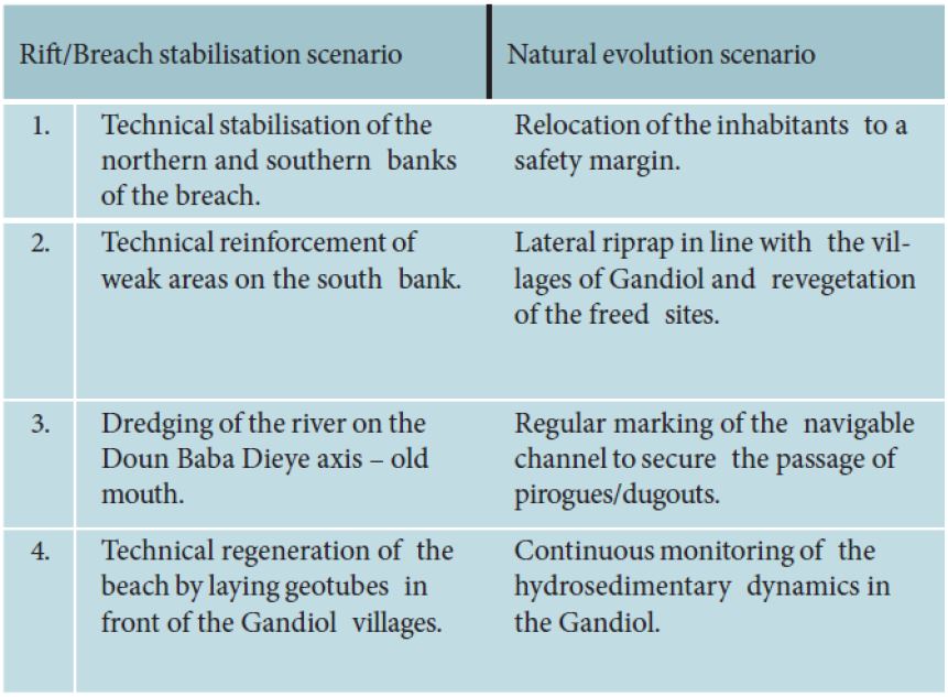 Au regard des impacts négatifs sur l’équilibre naturel de la Langue de Barbarie et de la lourdeur des moyens techniques et financiers nécessaires, le scénario de stabilisation de la brèche semble déconseillé. En partant de l’analyse et de l’évaluation des effets attendus de chaque scénario, l’étude de Sy et al. (2015) recommande l’application du scénario d’évolution naturelle : « laisser la brèche évoluer naturellement » jusqu’à ce que la Langue de Barbarie retrouve son équilibre (voir tableau 3).