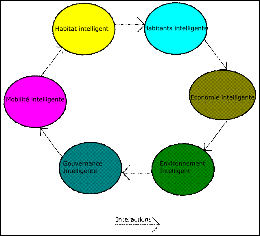 De plus, le paradigme systémique rappelle la pensée urbaine de la « cybernétique » des années 1950-1970, où la ville était envisagée comme un système d’information. Cette vision se concentre sur l’interconnexion des éléments urbains à travers des boucles de rétroaction (Townsend, 2013). Dans cette perspective, Giffinger et al. (2007) identifie six dimensions pour définir la smart city : une économie, une administration, un environnement, une mobilité et des habitants intelligents. En d’autres termes, une ville intelligente harmonise plusieurs sous-systèmes autour des thématiques économique, sociale et environnementale, avec les usages numériques comme outils.