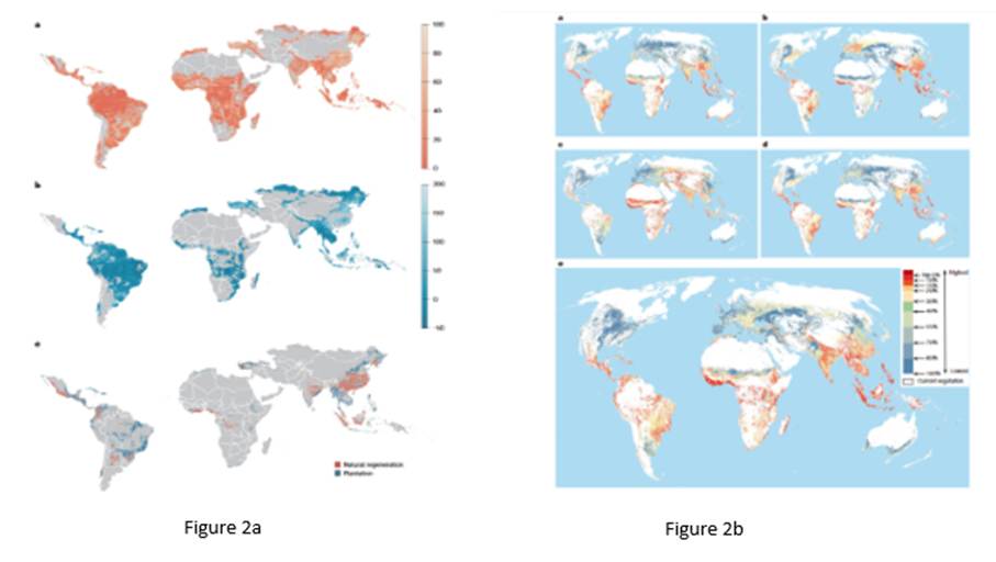 Un nombre croissant de travaux spatialisent ces analyses spatialisées afin d’informer sur la répartition géographique de l’effort de restauration de la biodiversité (figures 1 et 2). Ces analyses produisent des cartes à partir des caractéristiques écologiques et socio-économiques d’espaces géographiques variés pour prioriser efficacement les actions en faveur de l’environnement. La priorisation géographique est obtenue par la maximisation de rendements biophysiques ou de bénéfices socio-économico-écologiques[4] et par la minimisation des coûts. Cette méthode repose sur l’hypothèse d’une substituabilité, ou du moins d’une comparabilité, des actions écologiques entre les espaces géographiques, à une échelle nationale, régionale ou mondiale. Par exemple, Mirzabaev et al. publiaient en 2022 un article empirique — Economic Efficiency and Targeting of the African Great Green Wall — identifiant les zones les plus efficientes économiquement pour la restauration des écosystèmes de la Grande Muraille verte[5] (figure 1). D’autres publications ont utilisé ces méthodes à l’échelle mondiale (figure 2). En 2020, Strassburg et al. publiaient une carte du monde de sites prioritaires à restaurer en optimisant trois critères — le gain de biodiversité, l’atténuation du changement climatique et les coûts — pour l’ensemble des biomes terrestres et selon 1 200 scénarios (encadré 1 ; figure 2 a). Autre exemple, l’économiste Jonah Busch et al. publiaient en 2024 une priorisation coût-efficacité de deux techniques de restauration écologique distinctes — la régénération naturelle et les plantations d’arbres — en intégrant l’utilisation de données spatialisées sur le stockage du carbone dans les sols à l’échelle globale (figure 2 b).