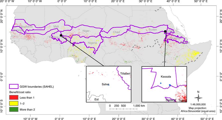 Note de lecture : La carte présente les ratios coût/bénéfice projetés des activités futures de restauration des terres dégradées dans le Sahel entre 2001 et 2018 avec un taux d’actualisation de 10 %.