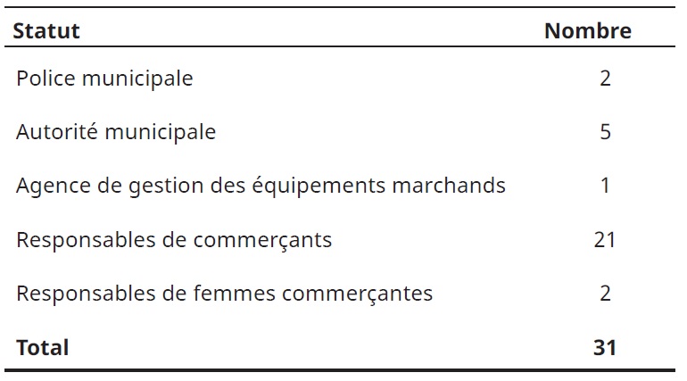 Le second volet de la collecte des données a été la réalisation d’entretiens semi-directifs auprès des différents acteurs. Son objectif était d’arriver à saisir les représentations et les stratégies des acteurs face à la maladie. Il a concerné des propriétaires de boutiques, mais aussi des acteurs administratifs des marchés et des agents de la police municipale ayant concouru au respect des mesures barrières dans les marchés et yaars. Les commerçants ont été interviewés dans les marchés. Les acteurs institutionnels (police, gestionnaires des marchés, responsables des associations de commerçants) l’ont été dans leurs locaux. L’enquête qualitative a concerné 31 personnes réparties comme suit :