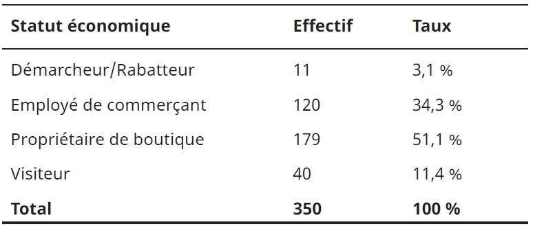 Les propriétaires des boutiques représentent la majorité des enquêtés, avec 51 %, suivis des employés (34 %). Les employés et les « démarcheurs » constituent une population vulnérable sur le plan économique, avec des emplois instables.
