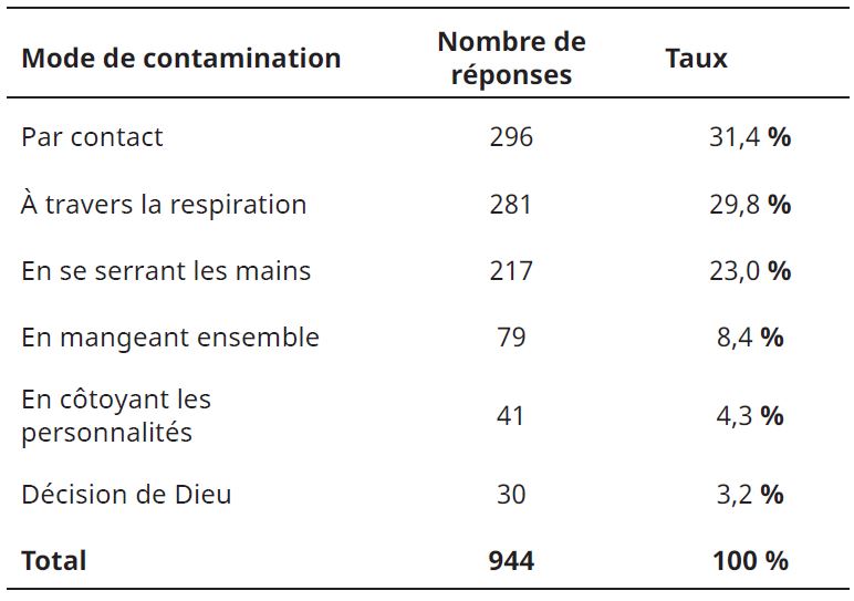 L’ensemble des enquêtés semble avoir une bonne connaissance des voies de contamination de la maladie. Ils mettent en cause les relations de proximité comme « être en contact » avec une personne malade (31,4 %) ; la respiration (29 %) ; « serrer les mains » (23 %) et « manger ensemble » (8,4 %). Seule une minorité cite le fait de « côtoyer une personnalité » (4,3 %) et la « décision de Dieu » (3,2 %). Ces savoirs théoriques se sont formés à la suite du tapage médiatique au moment du pic épidémique. En effet, le tableau 5 indique les canaux d’information des acteurs des marchés.