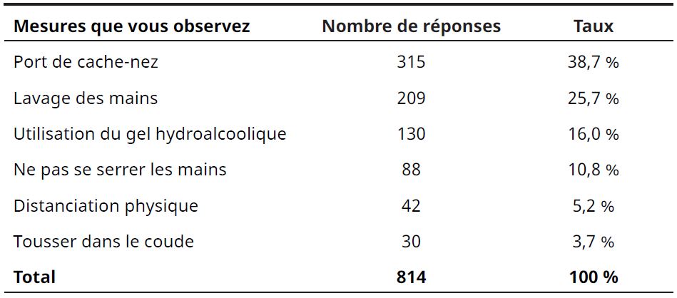Les mesures de protection contre la Covid-19 ont été peu appliquées : environ 38,7 % ont utilisé le masque, 25,7 % le lavage des mains, 16 % le gel. Pour les autres mesures, l’observance a été faible, notamment pour les « salutations » (10,8 %) et la distanciation physique (5,2 %).