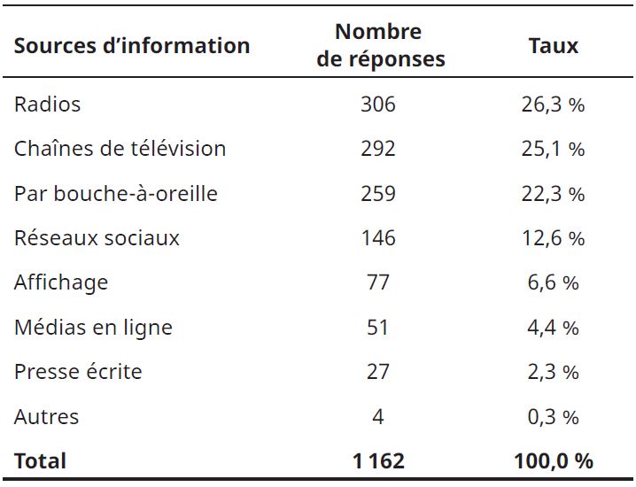 La principale source d’information a été la radio (26,3 %), qui est suivie par les chaînes de télévision (25,1 %), la communication informelle (22,3 %) et les réseaux sociaux (12,6 %). La situation de fermeture des marchés et la limitation des déplacements sont propices au recours à ces médias et aux causeries dans les quartiers. C’est ainsique les commerçants ont également une relative bonne connaissance des mesures de prévention.