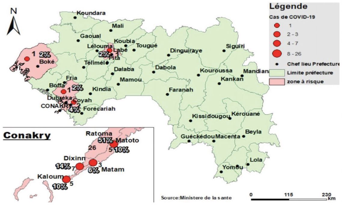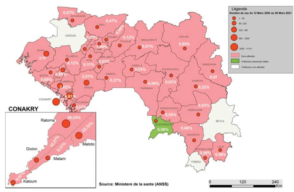 Pendant les quatre premiers mois de la survenue de la maladie, les communes de Dixinn et de Ratoma, abritant des expatriés, hauts fonctionnaires, grands commerçants et/ou hommes d’affaires, présentent les taux de contamination les plus élevés, comme le montre la carte 1. Cependant, en dépit des mesures prises et de la volonté politique affichée de contenir la diffusion du virus, l’ensemble des quartiers – aux profils socioéconomiques contrastés – de Conakry est touché, après plusieurs mois d’incursion de la maladie. Et au-delà de la capitale, la propagation s’est développée et a atteint plusieurs villes de l’intérieur du pays (carte 2). Au courant du mois de septembre 2020, les observateurs évoquent une « transmission communautaire » (MVAT/DATU et UN-Habitat , 2020) qui touche toutes les couches de la population. La diffusion du virus de la Covid-19 en Guinée est donc verticale et descendante, allant de l’élite aux couches sociales les plus populaires.