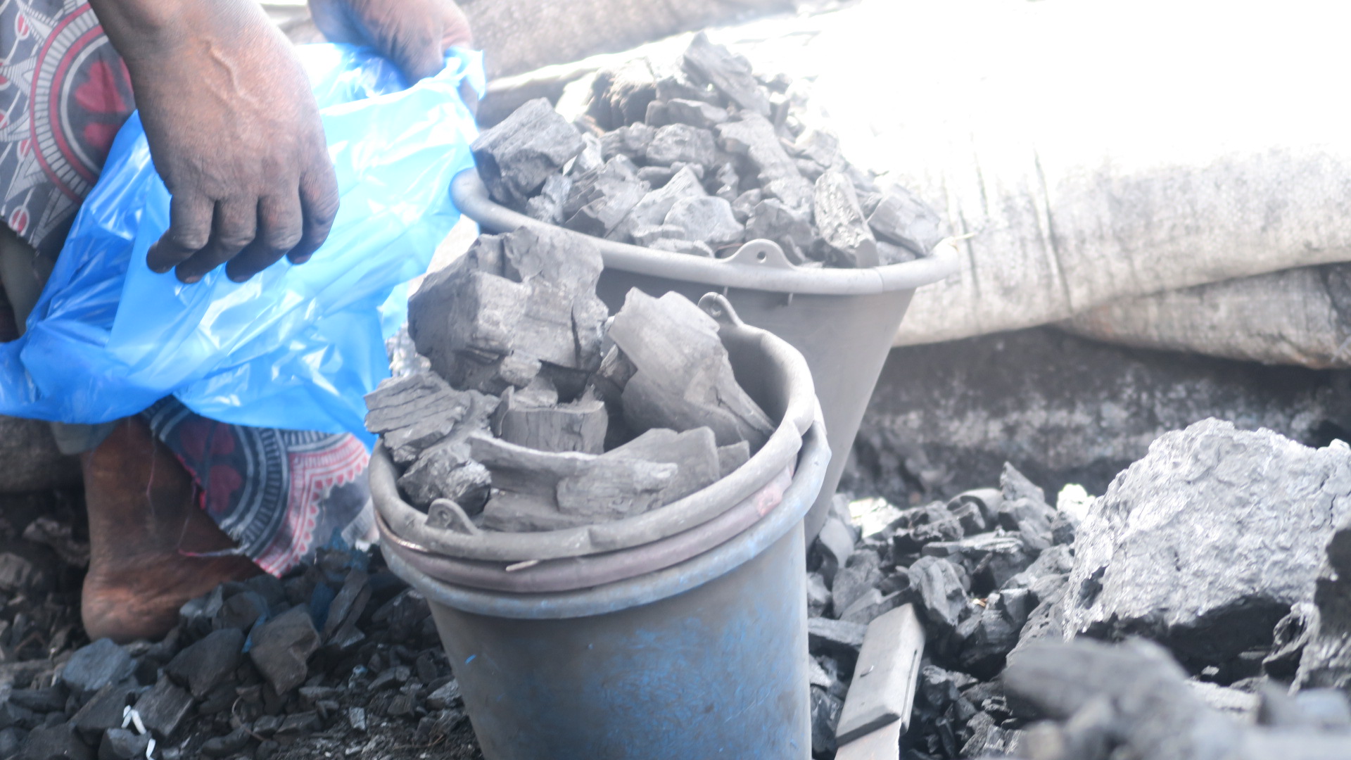 Photo 2 : Une vendeuse de charbon de bois prépare un sac de 500 francs CFA. Cette quantité permet de préparer quelques repas.