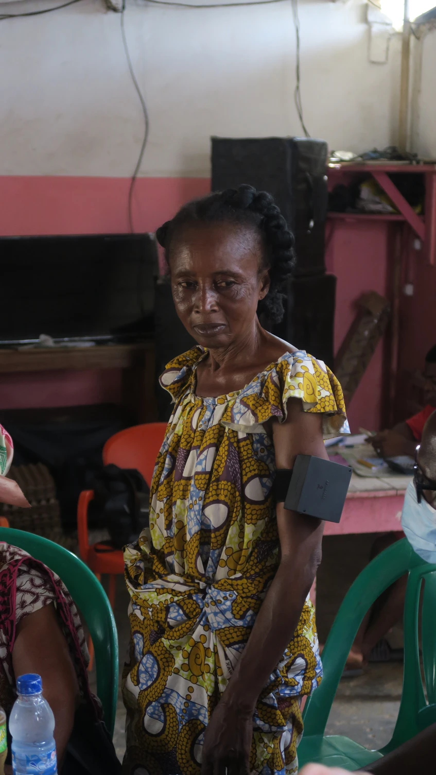 « Non, ce n’était pas pour faire rire. En fait, je veux montrer à mes sœurs, tu sais […] c’est l’Afrique, hein. Quand il y a quelque chose, on dit ça prend beaucoup d’ampleur. Donc j’ai porté ça pour leur montrer que ce n’est pas quelque chose qui est lourd […], c’est adaptable, tu fais tout ce que tu veux avec. […] En fait je veux les encourager de porter l’appareil pour voir, pour nous-mêmes, notre santé. »