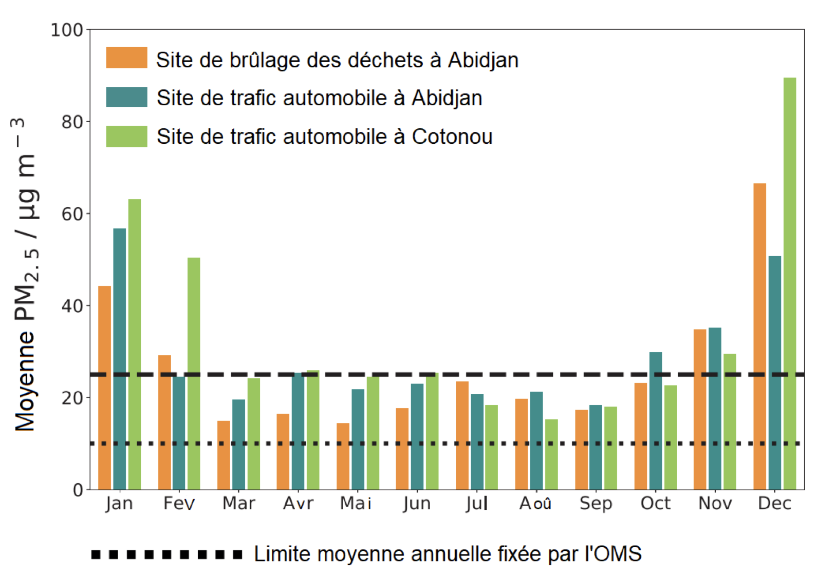 La ligne pointillée indique la concentration limite recommandée par l’OMS en moyenne annuelle. La ligne en traits discontinus indique la concentration limite recommandée par l’OMS en moyenne sur 24 heures. Source : Evans et al. (2018) « Conclusion du projet DACCIWA à l’intention des décideurs ».