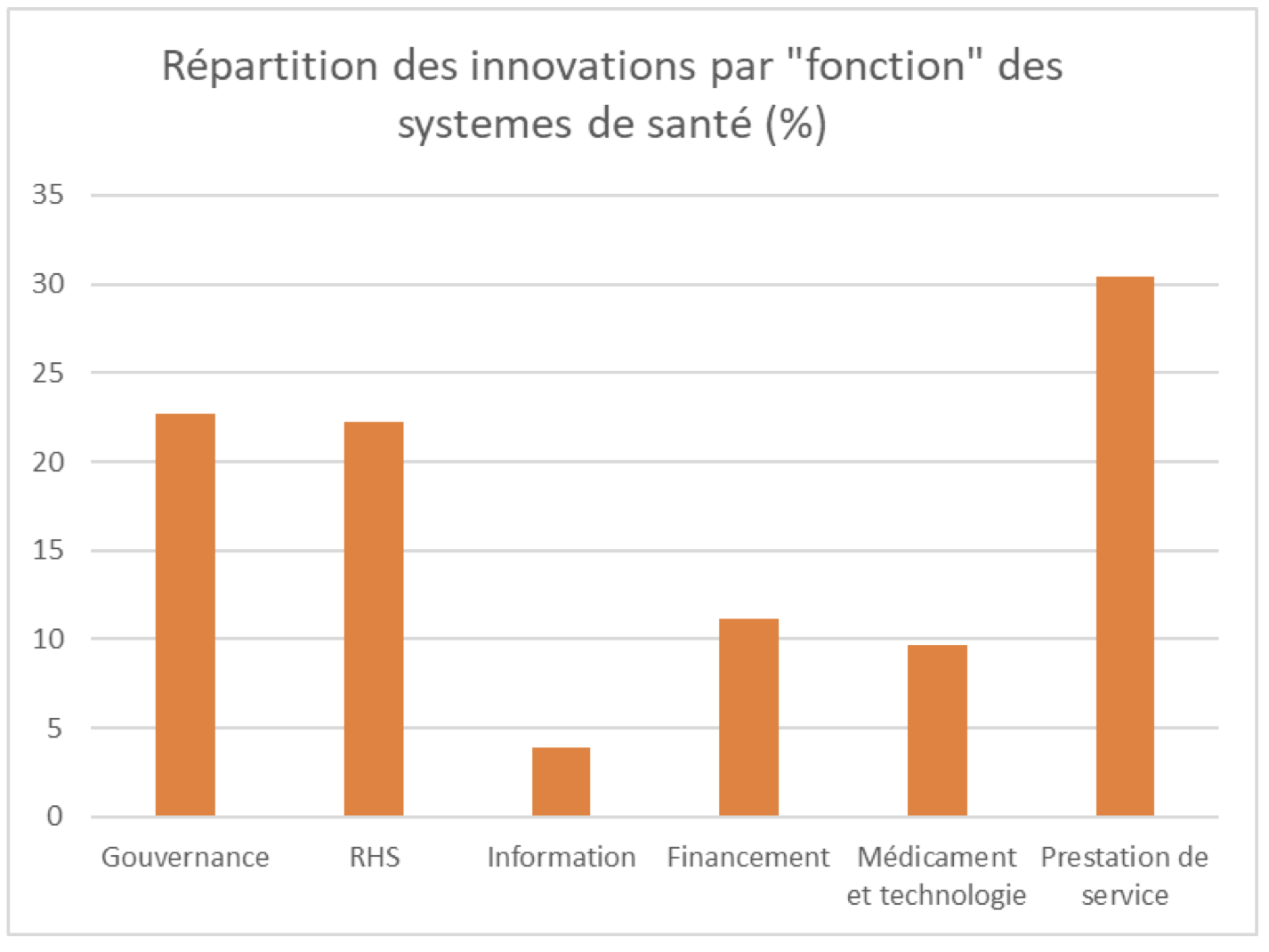 Les innovations « par le bas » documentées apportent essentiellement des réponses à des problèmes de gouvernance (22 %), de ressources humaines de santé (22 %) et de prestations de services (30 %). Les innovations identifiées qui répondent aux défis d’amélioration de l’information sanitaire, du financement et de la disponibilité des médicaments et technologies sont plus rares.
