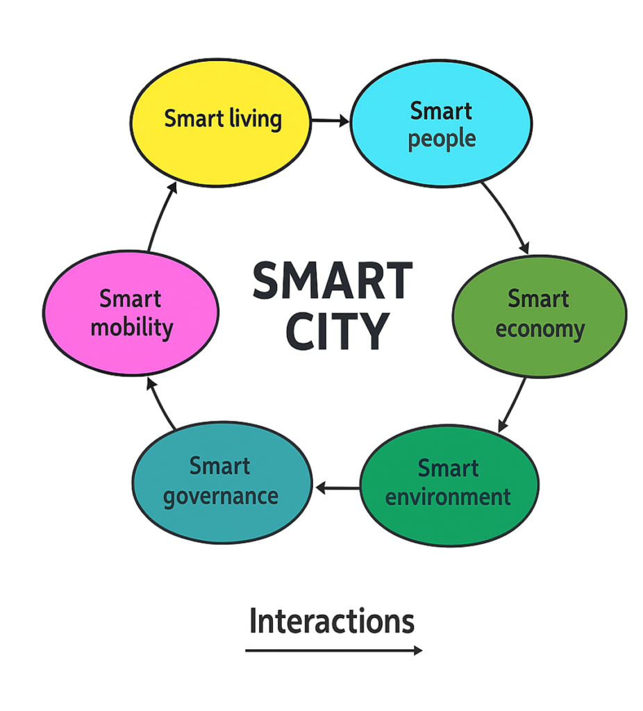 Furthermore, this systemic paradigm echoes the urban thinking of “cybernetics” from the 1950s to 1970s, when the city was conceived as an information system. This vision focuses on the interconnection of urban elements through feedback loops (Townsend, 2013). In this perspective, Giffinger et al. (2007) identifies six dimensions to define a smart city: a smart economy, smart governance, a smart environment, smart mobility, smart living, and smart people. In other words, a smart city harmonizes multiple subsystems around economic, social, and environmental issues, using digital technologies as tools.