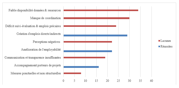 La recherche dans les bases de données a permis de recenser 153 études publiées dans des bases indexées, dont 63 ont finalement satisfait aux critères d’inclusion. L’analyse des données a permis de mettre en évidence trois grands ensembles de réussites des politiques : 1) la création d'emplois directs et indirects ; 2) l’amélioration de l'employabilité ; 3) l’accompagnement des porteurs de projets. En parallèle, six lacunes majeures ont été identifiées : 1. une communication insuffisante et un manque de transparence ; 2. un déficit dans le suivi-évaluation des programmes et précarité des emplois créés ; 3. une faible coordination des politiques ; 4. des perceptions négatives sur les politiques mises en œuvre ; 5. la prédominance de mesures ponctuelles plutôt que structurelles ; 6. une faible disponibilité des données et des ressources.